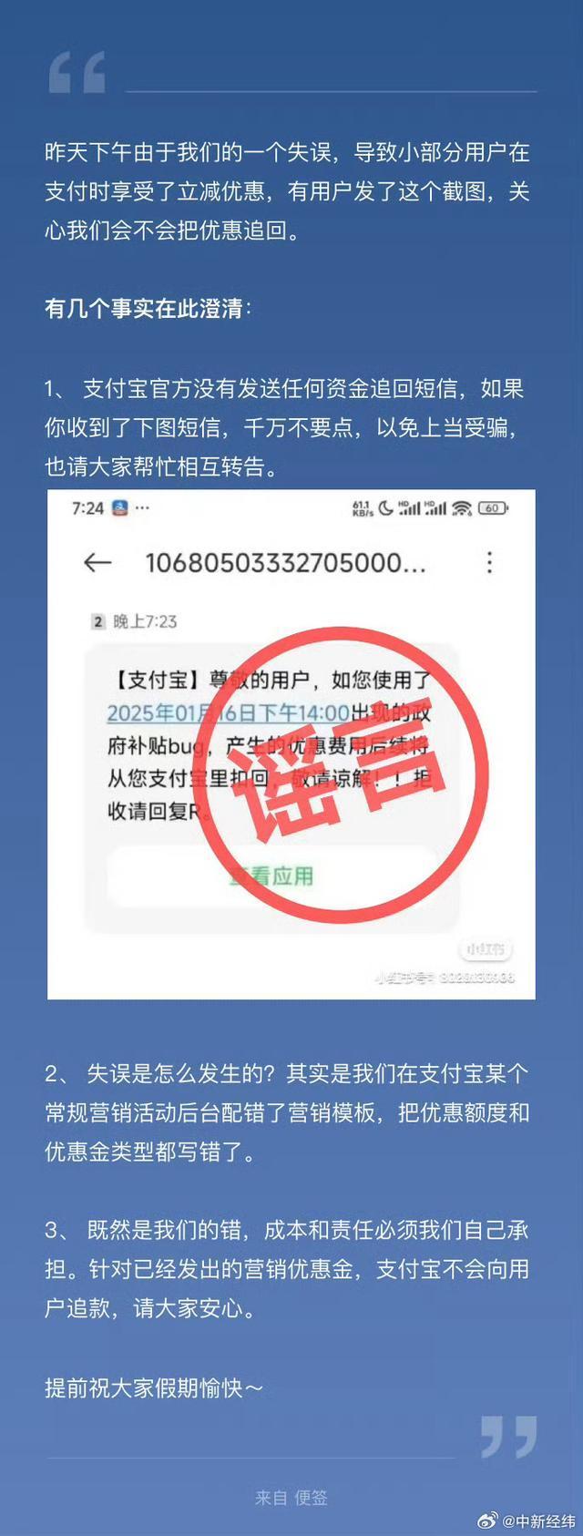 17日凌晨,@支付宝 发文称,昨天下午由于我们的一个失误,导致小部分用户在支付时享受了立减优惠,有用户发了这个截图,关心我们会不会把优惠追回。详情↓ 来源:中新经纬...